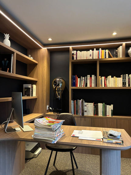 L’agencement s’organise autour d’une estrade sur mesure intégrant un lit double escamotable, permettant de libérer l’espace selon les usages et de transformer la pièce avec fluidité (le lit étant sur des roulettes). En surplomb, un bureau sur mesure vient prolonger la composition et créer un véritable espace de travail, tandis qu’en périphérie, un linéaire de rangements et une bibliothèque rétroéclairée renforcent à la fois la fonctionnalité du projet et sa présence visuelle. Chaque élément a été pensé, dessiné et réalisé dans les moindres détails.